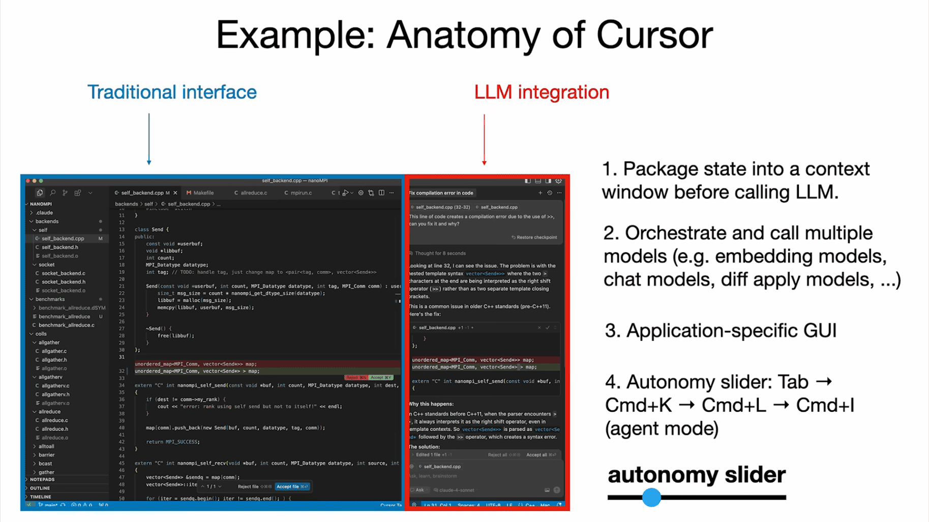 • They orchestrate multiple calls to LLMs, right? So in the case of Cursor, there's under the hood embedding models for all your files, the actual chat models, models that apply diffs to the code, and this is all orchestrated for you.