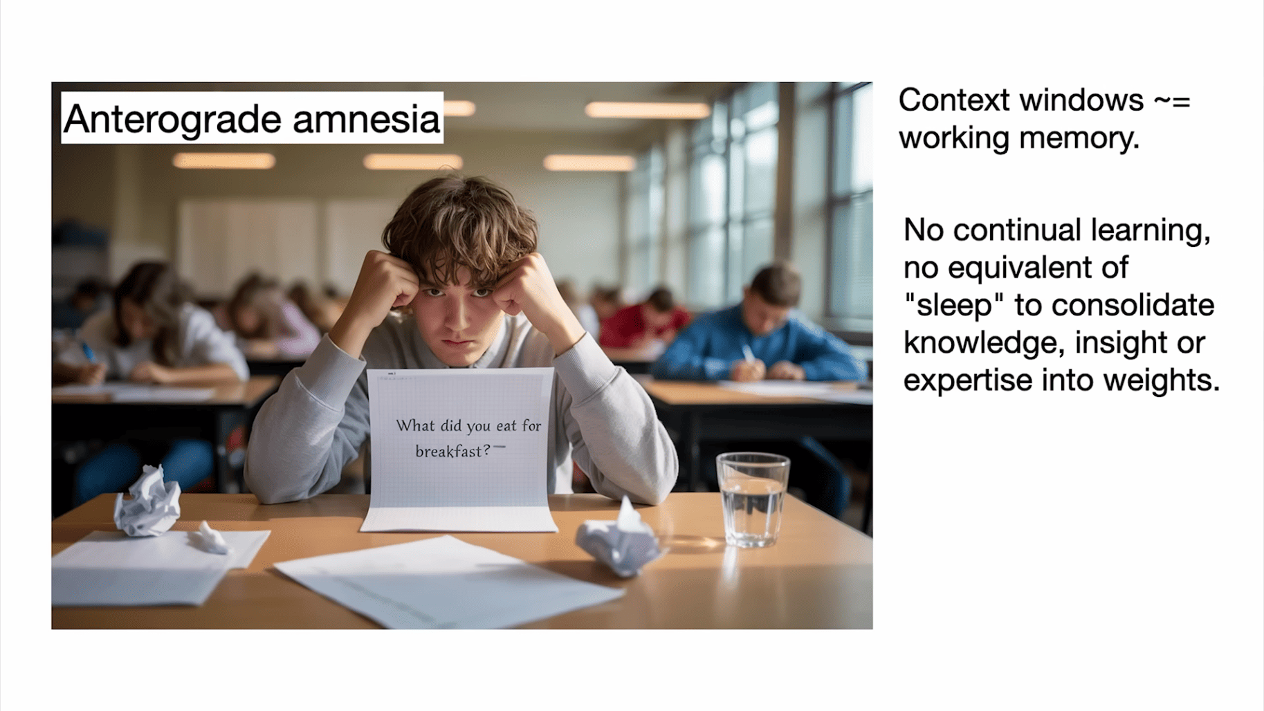 They also suffer from retrograde amnesia, and I think I'm alluding to the fact that if you have a coworker who joins your organization, this coworker will over time learn your organization, and they will understand and gain a huge amount of context on the organization, and they go home and they sleep and they consolidate knowledge and they develop expertise over time.