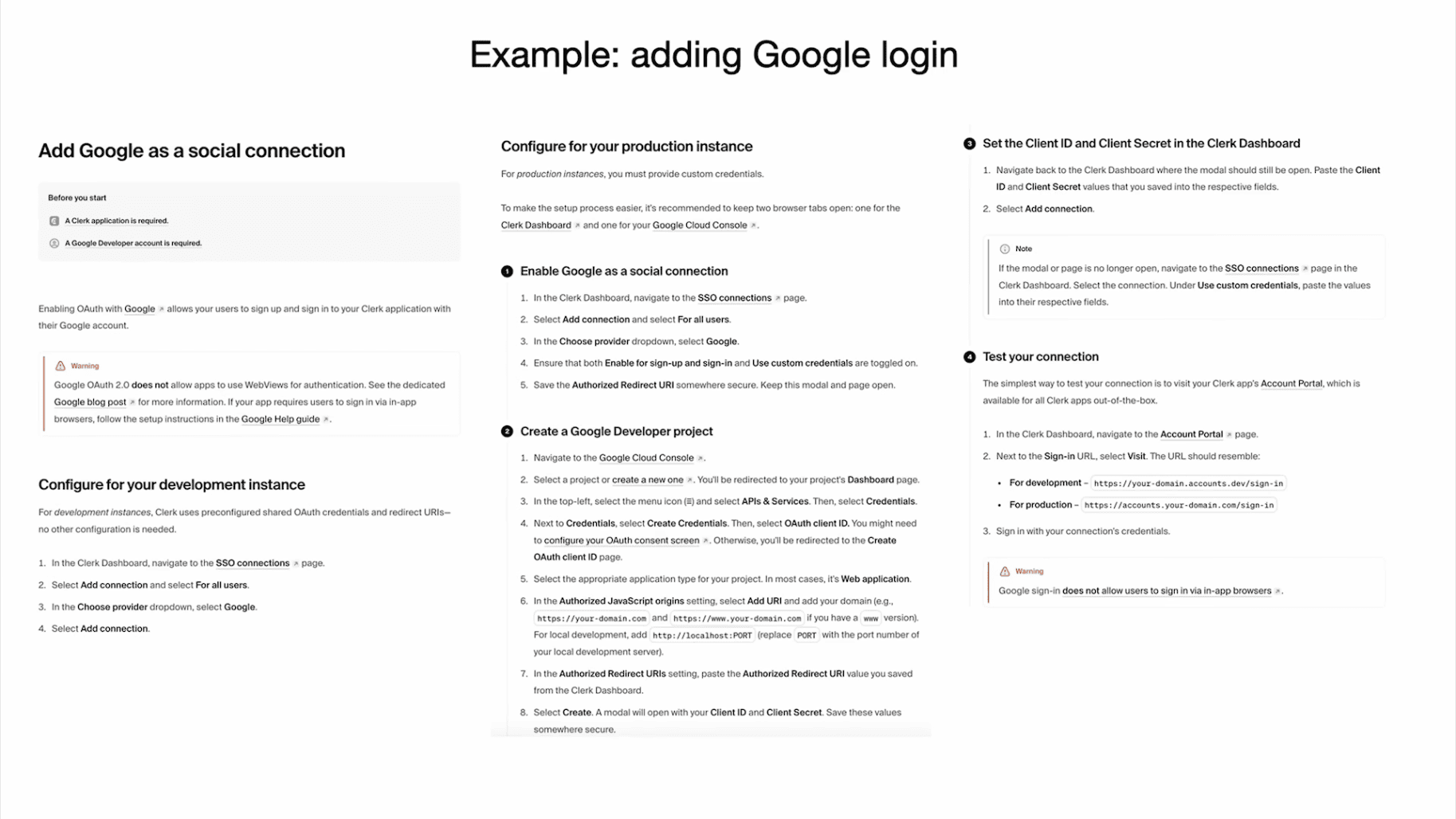 So for example, if you try to add Google Login to your web page, I know this is very small, but just a huge amount of instructions of this Clerk library telling me how to integrate this. And this is crazy. It's telling me go to this URL, click on this dropdown, choose this, go to this, and click on that. And it's telling me what to do. A computer is telling me the actions I should be taking. You do it. Why am I doing this? What the hell? I had to follow all these instructions. This was crazy.