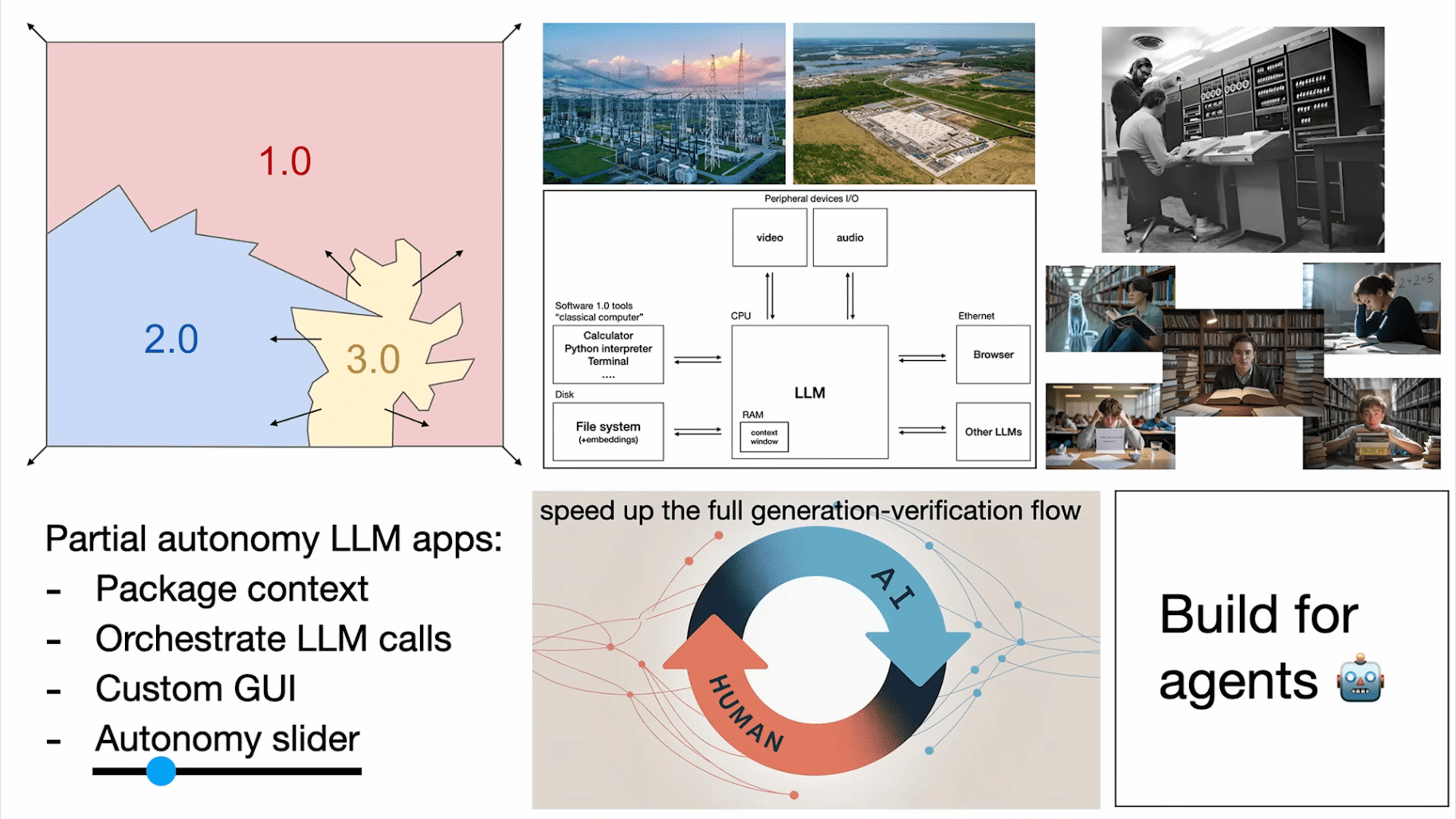 And these LLMs are like these fallible people spirits that we have to learn to work with. And in order to do that properly, we need to adjust our infrastructure towards it. So when you're building these LLM apps, I describe some of the ways of working effectively with these LLMs and some of the tools that make that possible and how you can spin this loop very, very quickly and basically create partial autonomy products and then a lot of code has to also be written for the agents more directly.