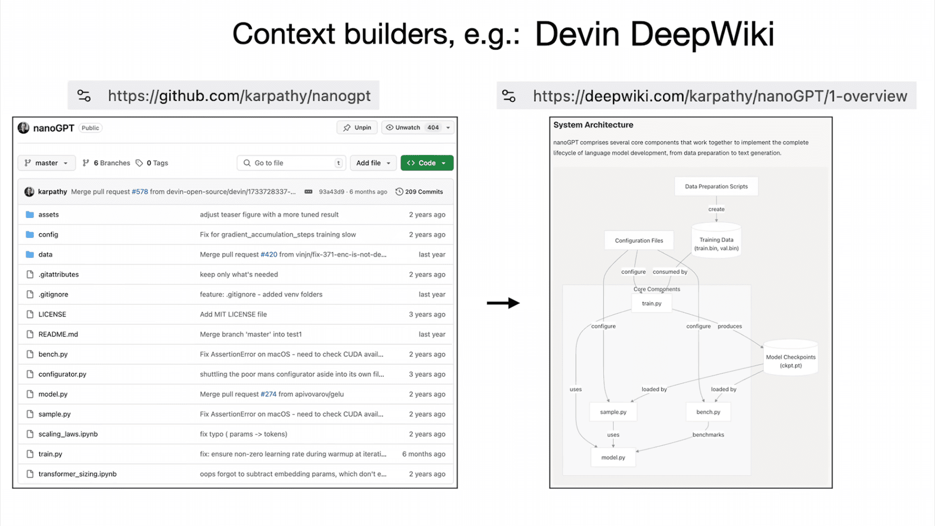 Maybe even more dramatic example of this is DeepWiki where it's not just the raw content of these files. This is from Devin, but also they have Devin basically do analysis of the GitHub repo, and Devin basically builds up a whole docs pages just for your repo, and you can imagine that this is even more helpful to copy-paste into your LLM.