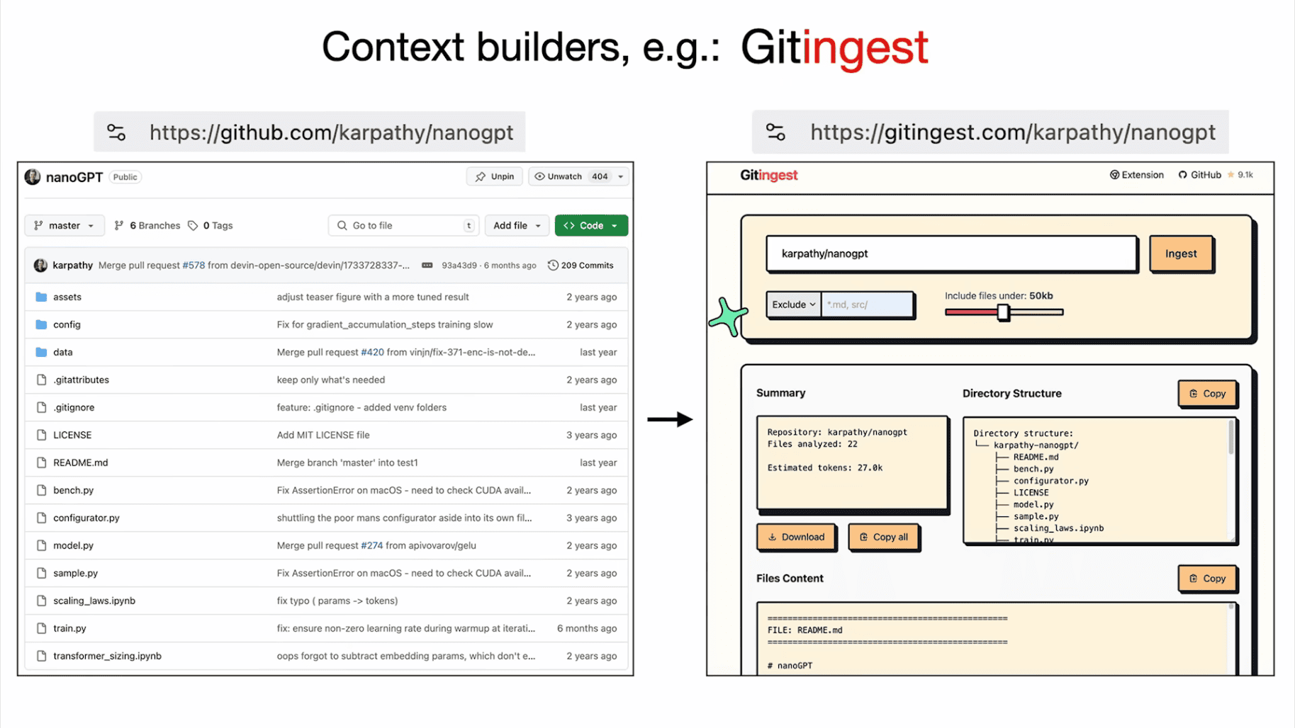 So when you just change the URL from github.com to gitingest.com, then this will actually concatenate all the files into a single giant text and it will create a directory structure, etc. And this is ready to be copy-pasted into your favorite LLM and you can do stuff.