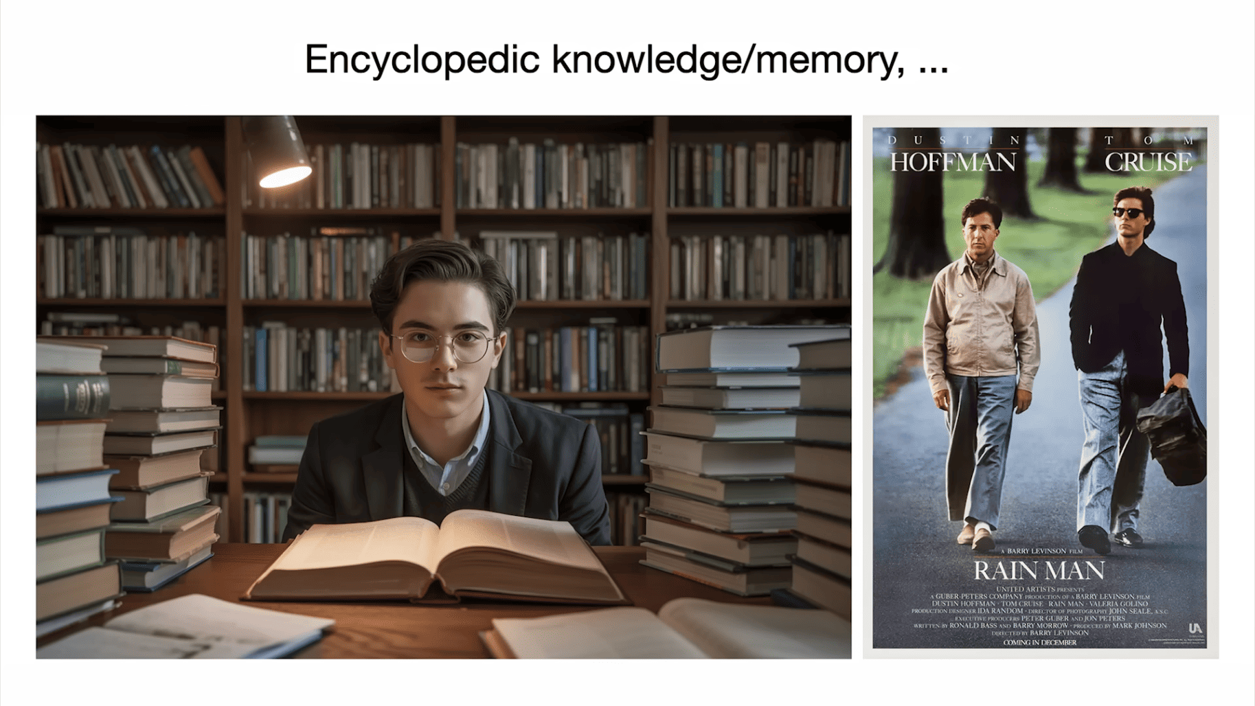 It actually reminds me of this movie Rain Man, which I actually really recommend people watch. It's an amazing movie. I love this movie. And Dustin Hoffman here is an autistic savant who has almost perfect memory. So he can read a phone book and remember all of the names and phone numbers. I feel like LLMs are very similar. They can remember SHA hashes and lots of different kinds of things very, very easily.