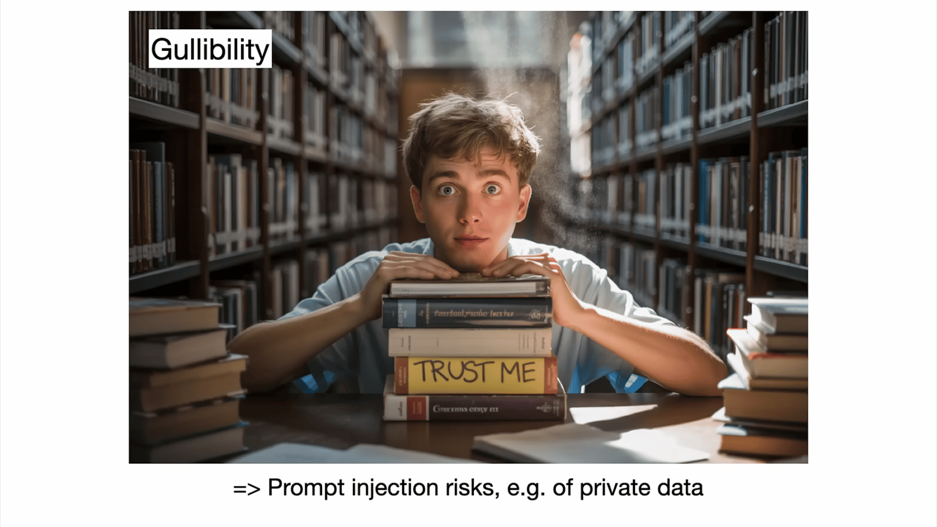 I guess one more thing I would point to is security-related limitations of the use of LLMs. So for example, LLMs are quite gullible. They are susceptible to prompt injection risks. They might leak your data, etc. And there are many other considerations security-related.