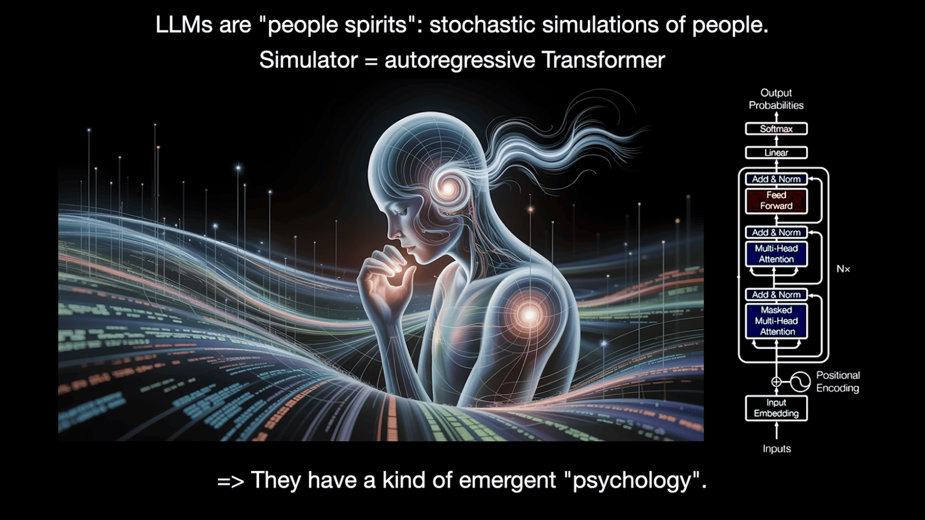 • Before we program LLMs, we have to spend some time to think about what these things are. I especially like to talk about their psychology. The way I like to think about LLMs is that they're like people spirits. They are stochastic simulations of people. The simulator in this case happens to be an autoregressive transformer.