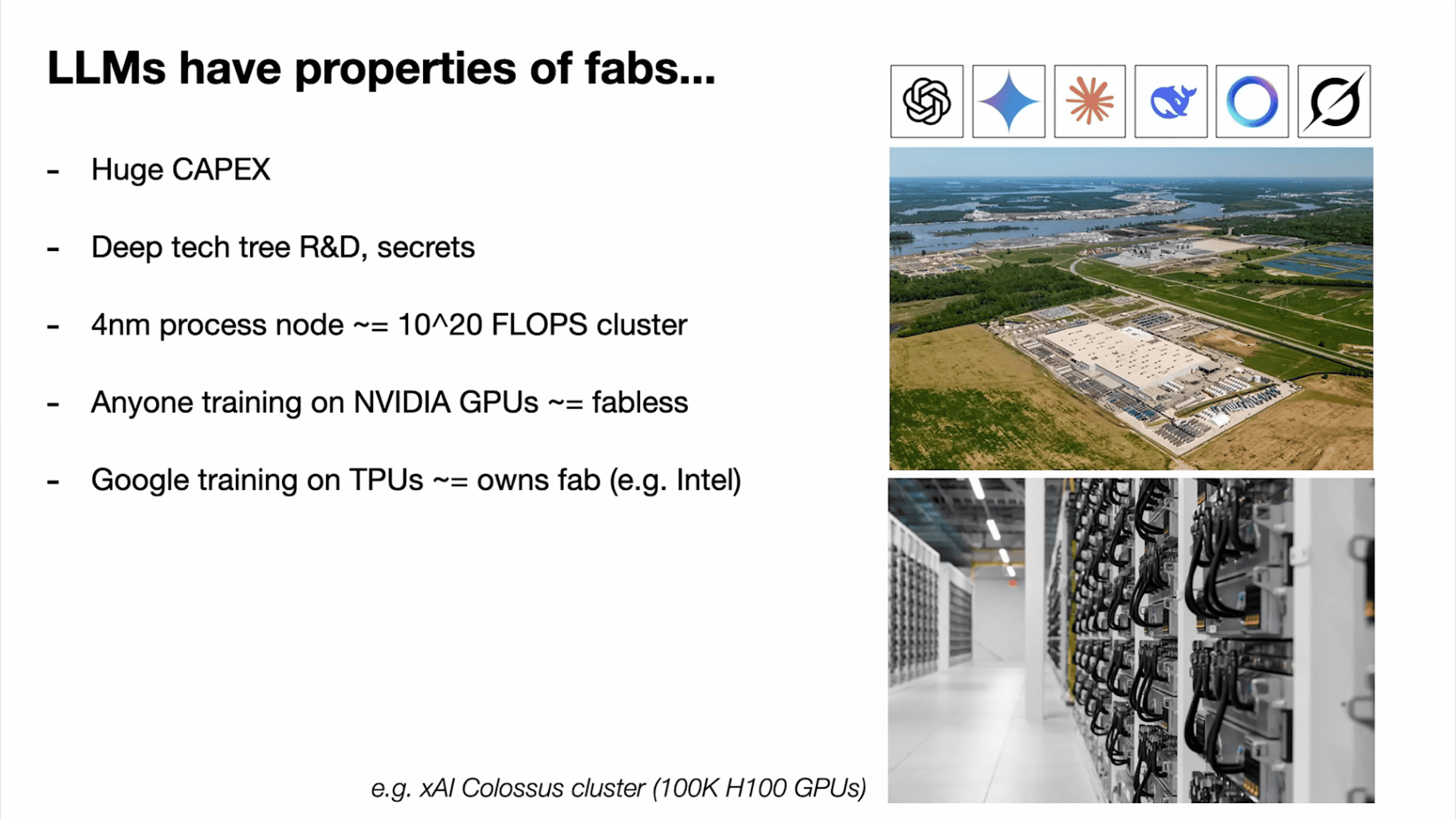 There are many analogies you can make: like a 4-nanometer process node maybe is something like a cluster with certain max FLOPS. You can think about when you're using Nvidia GPUs and you're only doing the software and you're not doing the hardware, that's like the fabless model. But if you're actually also building your own hardware and you're training on TPUs, if you're Google, that's like the Intel model where you own your fab.
