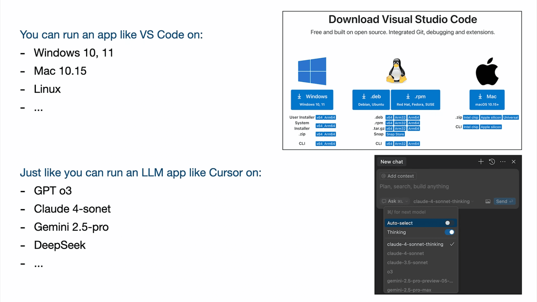 A few more analogies. For example, if you want to download an app, say I go to VS Code and I go to download, you can download VS Code and you can run it on Windows, Linux, or Mac. In the same way, you can take an LLM app like Cursor and you can run it on GPT or Claude or Gemini series, right? It's just a dropdown. So it's similar in that way as well.