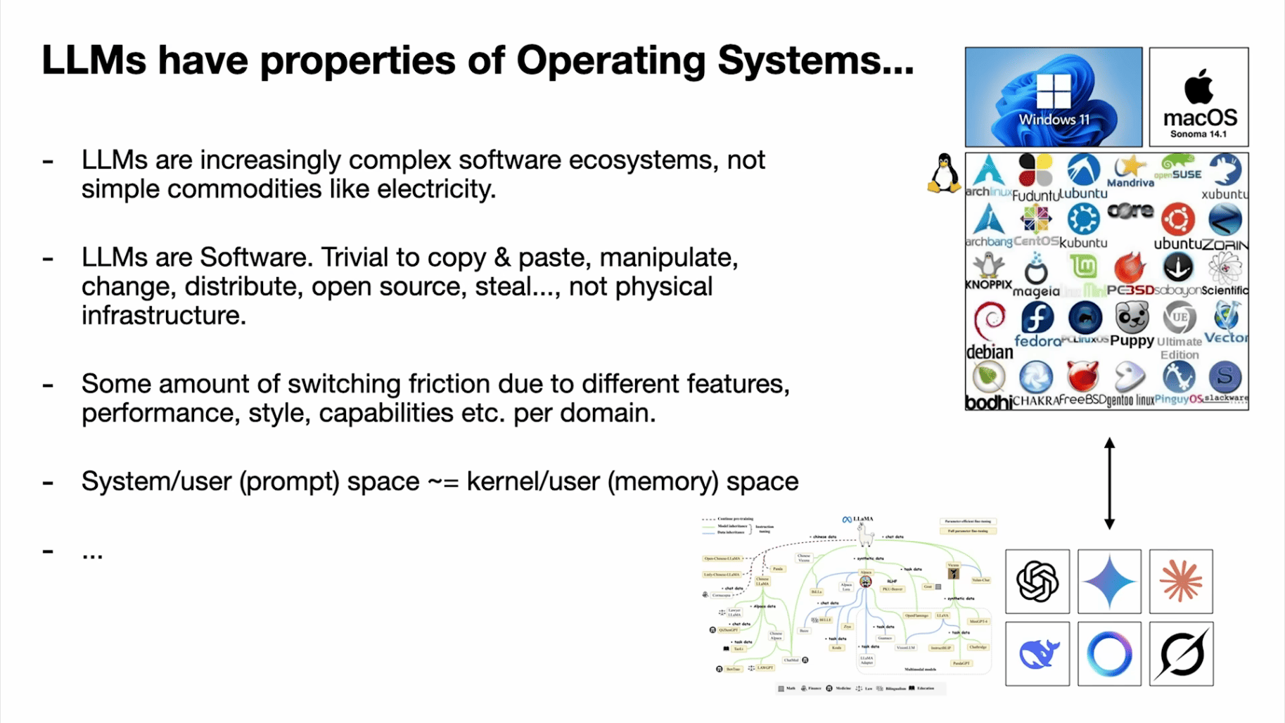 So I think there are some analogies here that make sense. But actually, I think the analogy that makes the most sense perhaps is that in my mind, LLMs have very strong analogies to operating systems. In that this is not just electricity or water. It's not something that comes out of the tap as a commodity. These are now increasingly complex software ecosystems, right? So they're not just simple commodities like electricity.