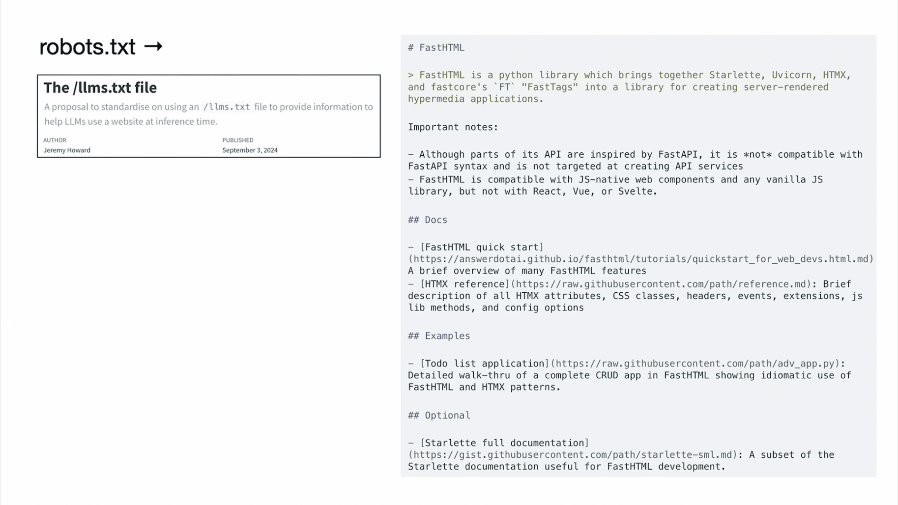 • So as an example, you can have robots.txt on your domain and you can instruct or advise web crawlers on how to behave on your website. In the same way, you can have maybe llms.txt file which is just a simple markdown that's telling LLMs what this domain is about, and this is very readable to an LLM. If it had to instead get the HTML of your web page and try to parse it, this is very error-prone and difficult and will screw it up and it's not going to work. So we can just directly speak to the LLM. It's worth it.