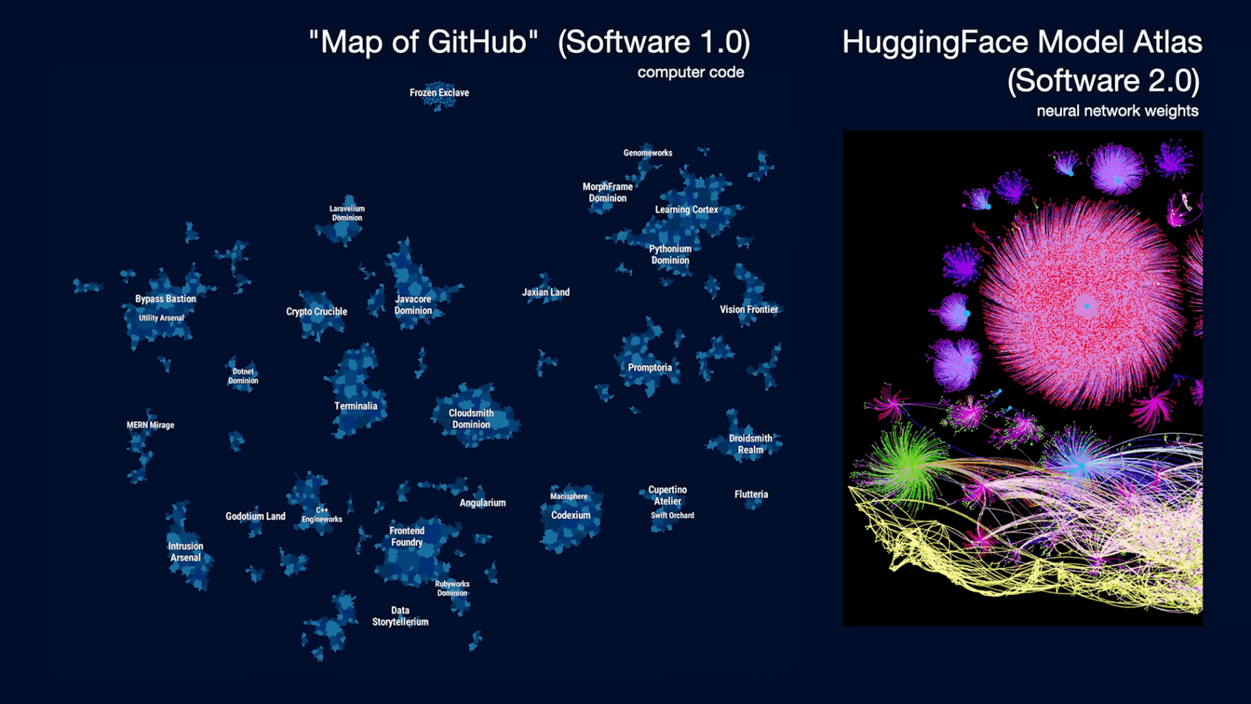 At the time, neural nets were seen as just a different kind of classifier, like a decision tree or something like that. I think this framing was a lot more appropriate. Now, what we have is an equivalent of GitHub in the realm of Software 2.0. I think Hugging Face is equivalent of GitHub in Software 2.0. There's also Model Atlas, and you can visualize all the code written there.