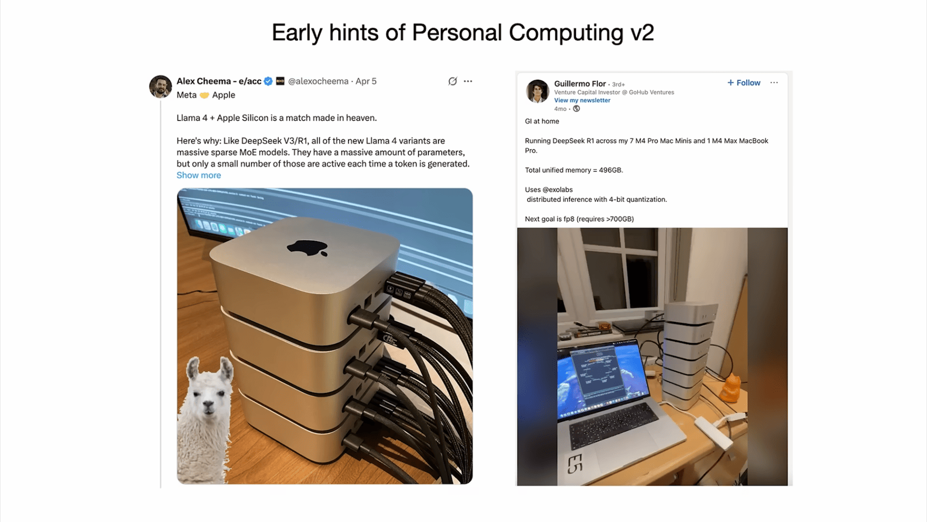 It turns out that Mac Minis, for example, are a very good fit for some of the LLMs because if you're doing batch one inference, this is all super memory-bound. So this actually works. I think these are some early indications maybe of personal computing. But this hasn't really happened yet. It's not clear what this looks like. Maybe some of you get to invent what this is or how it works or what this should be.