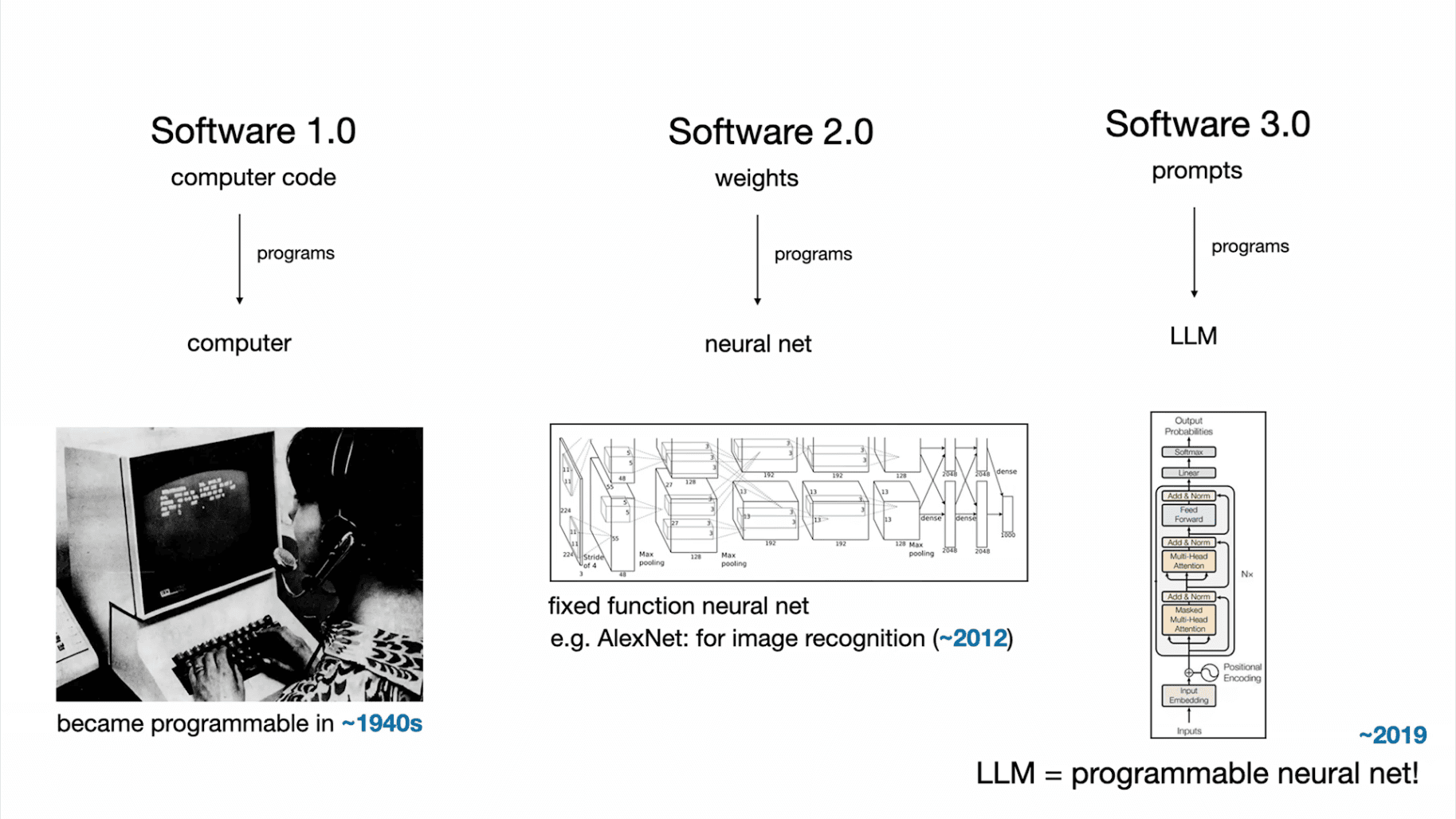 I see this as quite new, unique. It's a new kind of computer, so in my mind, it's worth giving it a new designation of Software 3.0. Your prompts are now programs that program the LLM. Remarkably, these prompts are written in English. So it's a very interesting programming language.