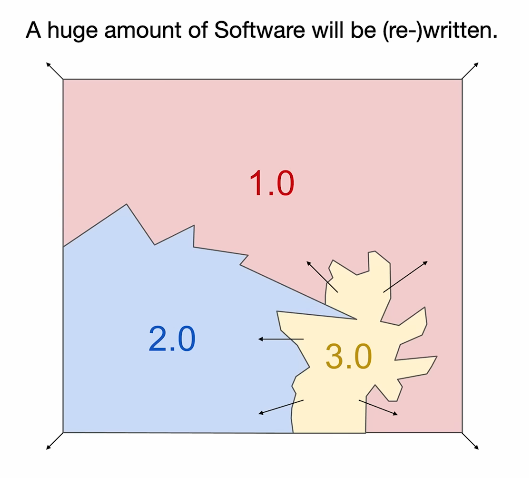 I thought this was really remarkable at the time, and I think we're seeing the same thing again where we have a new kind of software, and it's eating through the stack. We have three completely different programming paradigms, and I think if you're entering the industry, it's a very good idea to be fluent in all of them because they all have slight pros and cons, and you may want to program some functionality in 1.0 or 2.0 or 3.0. Are you going to train a neural net? Are you going to just prompt an LLM? Should this be a piece of code that's explicit, etc.? So we all have to make these decisions and actually potentially fluidly transition between these paradigms.