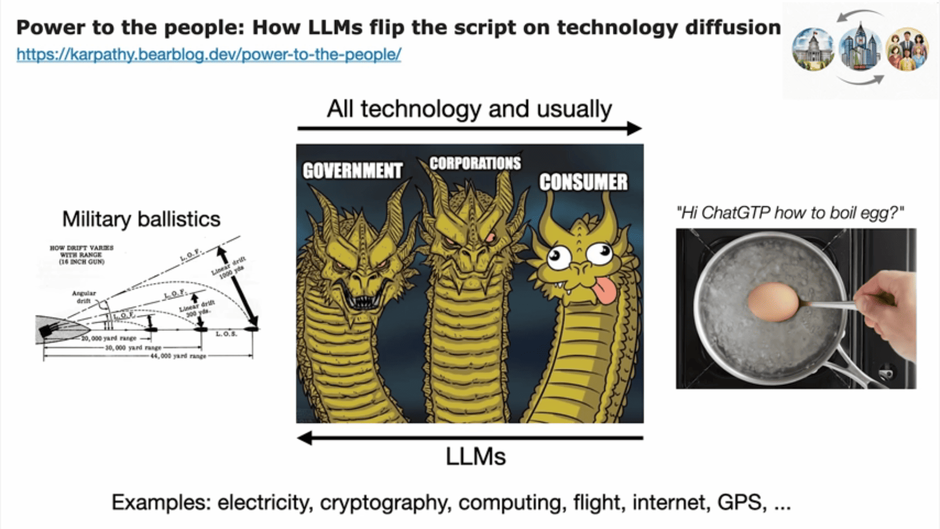 So maybe with early computers, it was all about ballistics and military use, but with LLMs, it's all about how do you boil an egg or something like that. This is certainly a lot of my use. So it's really fascinating to me that we have a new magical computer, and it's helping me boil an egg. It's not helping the government do something really crazy like some military ballistics or some special technology.