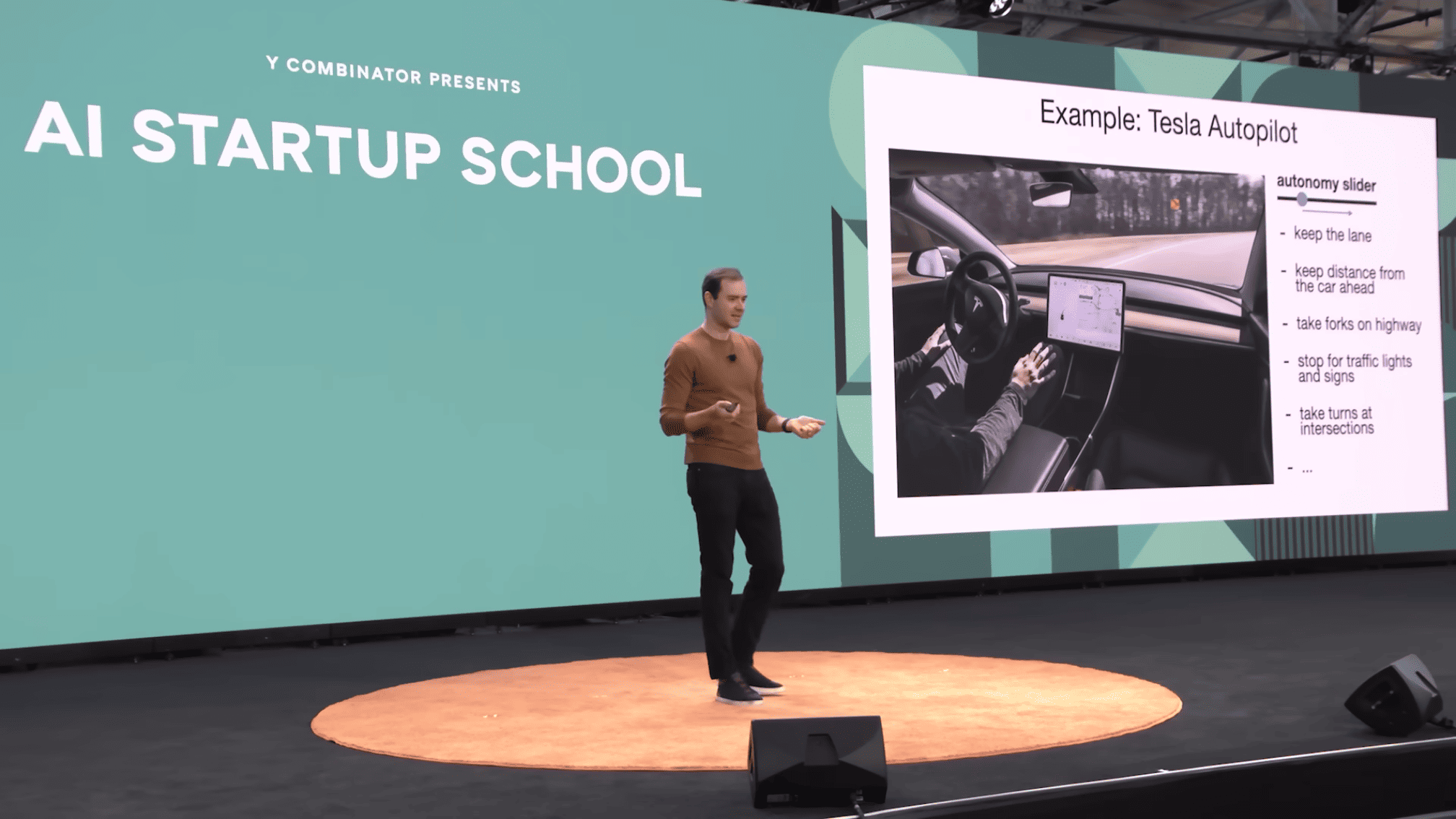 One more analogy I wanted to allude to is I'm no stranger to partial autonomy, and I worked on this I think for five years at Tesla, and this is also a partial autonomy product and shares a lot of the features. Like for example, right there in the instrument panel is the GUI of the autopilot, so it's showing me what the neural network sees and so on, and we have the autonomy slider where over the course of my tenure there, we did more and more autonomous tasks for the user.