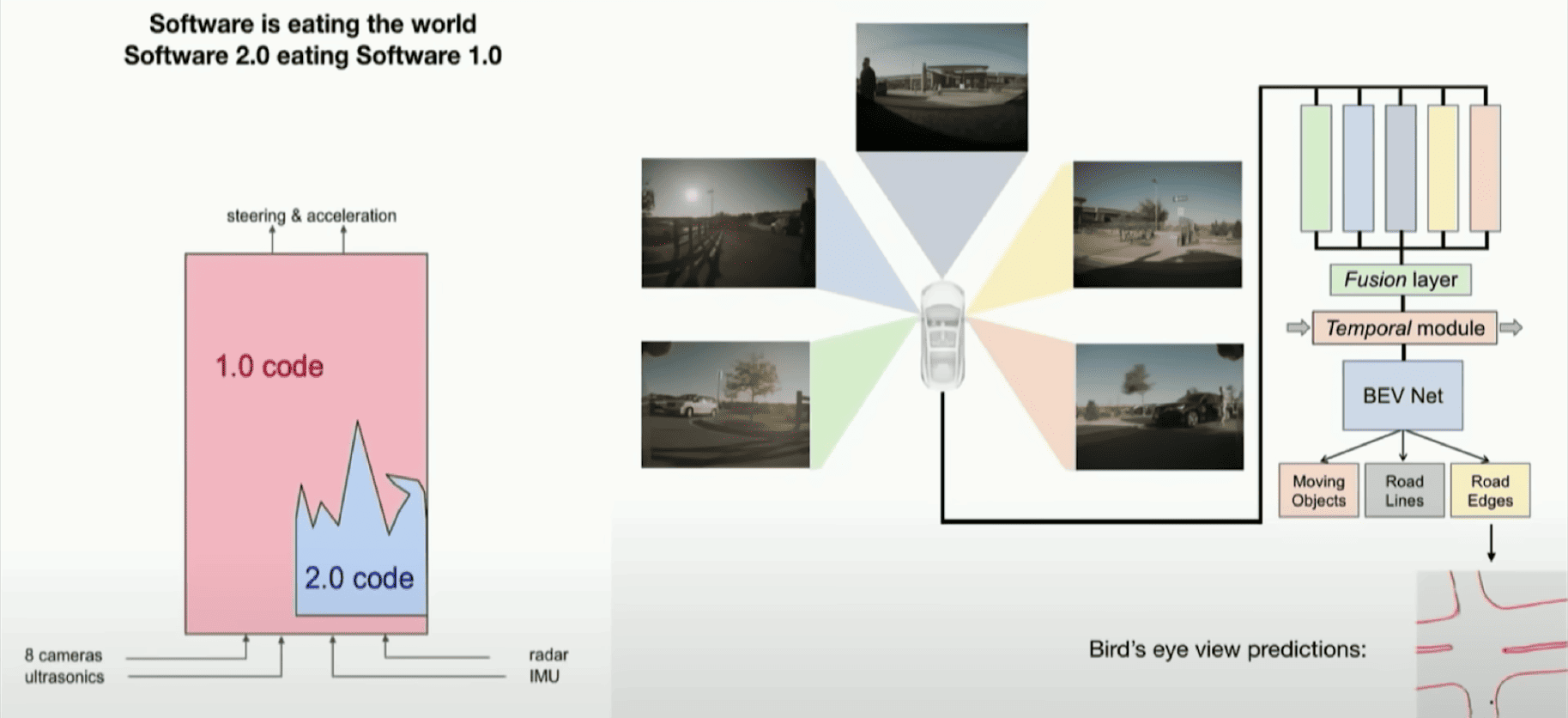 As an example, a lot of the stitching up of information across images from the different cameras and across time was done by a neural network, and we were able to delete a lot of code. So the Software 2.0 stack quite literally ate through the software stack of the autopilot.