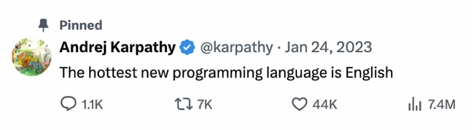 Not only is it a new programming paradigm, it's also remarkable to me that it's in our native language of English. When this blew my mind a few years ago now, I tweeted this, and I think it captured the attention of a lot of people, and this is my currently pinned tweet: remarkably we're now programming computers in English.