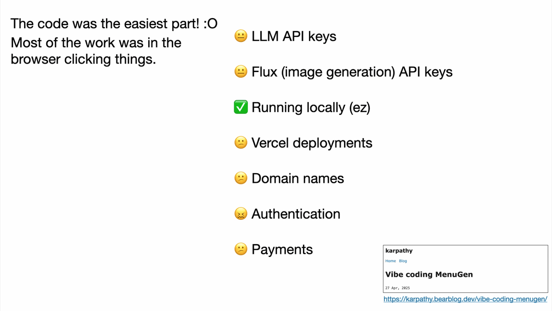 But the fascinating thing about MenuGen for me is that vibe coding part — the code was actually the easy part of vibe coding MenuGen, and most of it actually was when I tried to make it real so that you can actually have authentication and payments and the domain name and Vercel deployment. This was really hard, and all of this was not code. All of this DevOps stuff was me in the browser clicking stuff, and this was extremely slow and took another week.