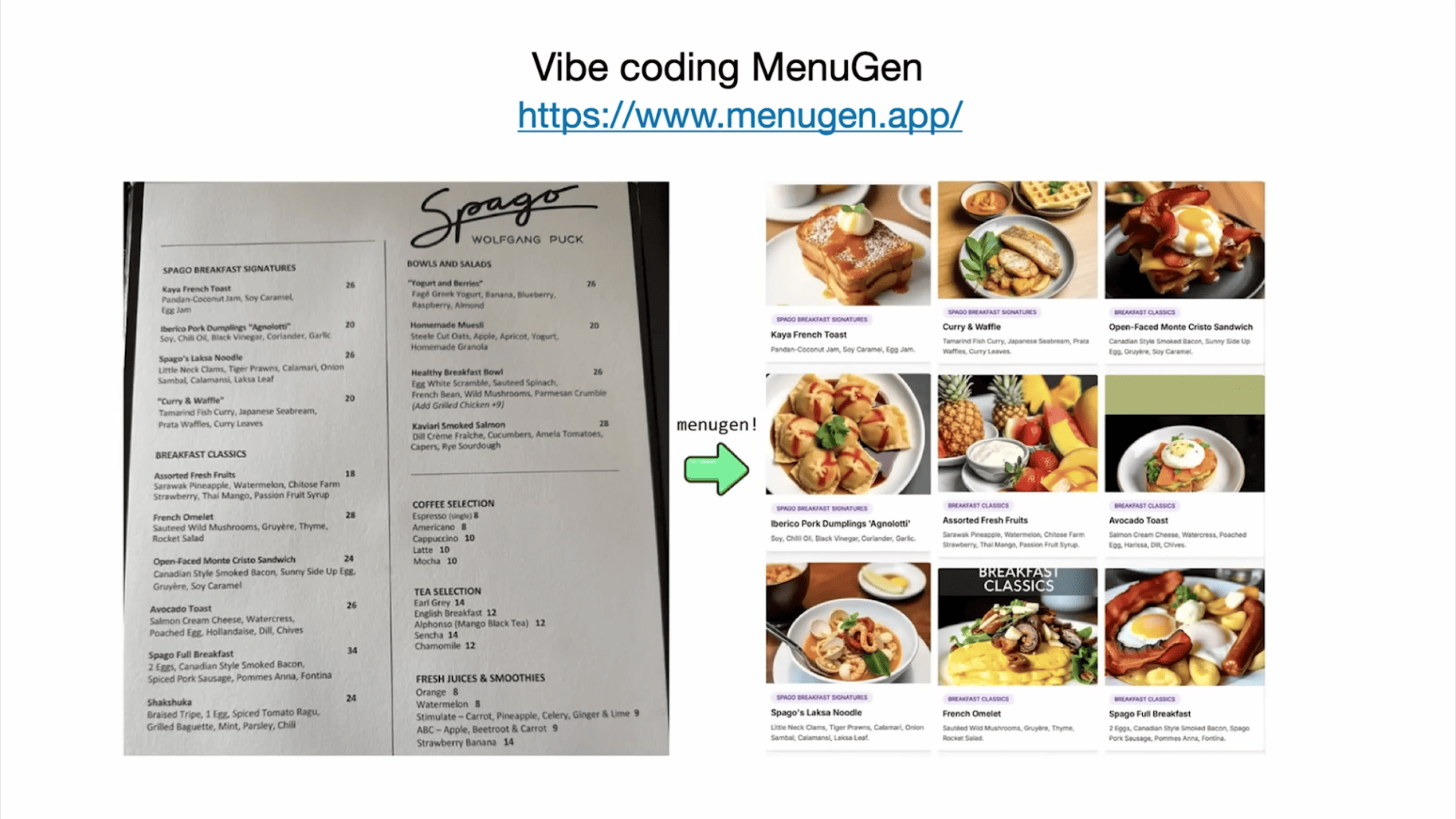 I also vibe-coded this app called Menu Gen. And this is live. You can try it at menugen.app. And I basically had this problem where I show up at a restaurant, I read through the menu, and I have no idea what any of the things are. And I need pictures. So this doesn't exist. So I was like, "Hey, I'm going to vibe code it."