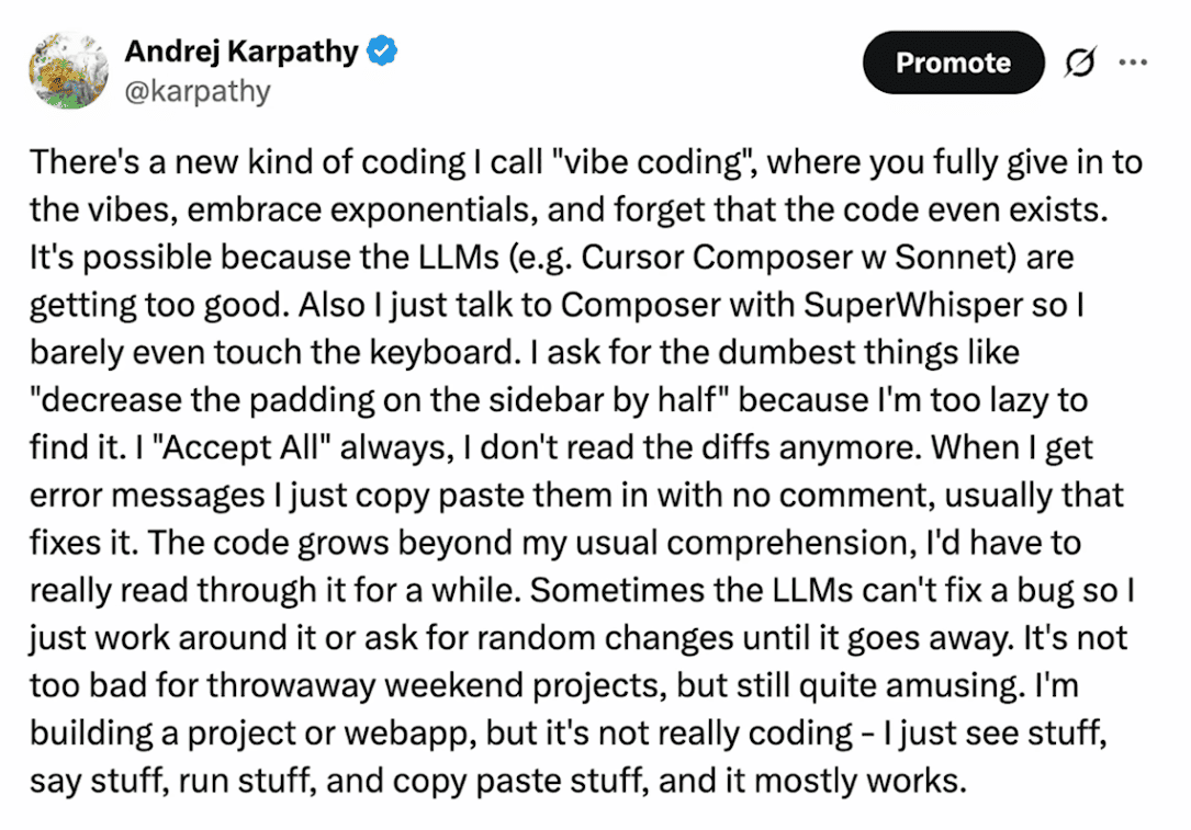 So, I don't know if by any chance anyone has heard of vibe coding. This is the tweet that introduced this, but I'm told that this is now a major meme. Fun story about this is that I've been on Twitter for like 15 years or something like that at this point, and I still have no clue which tweet will become viral and which tweet fizzles and no one cares. And I thought that this tweet was going to be the latter. I don't know. It was just a shower thought. But this became a total meme, and I really just can't tell. But I guess it struck a chord and it gave a name to something that everyone was feeling but couldn't quite say in words. So now there's a Wikipedia page and everything. This is a major contribution now or something like that.