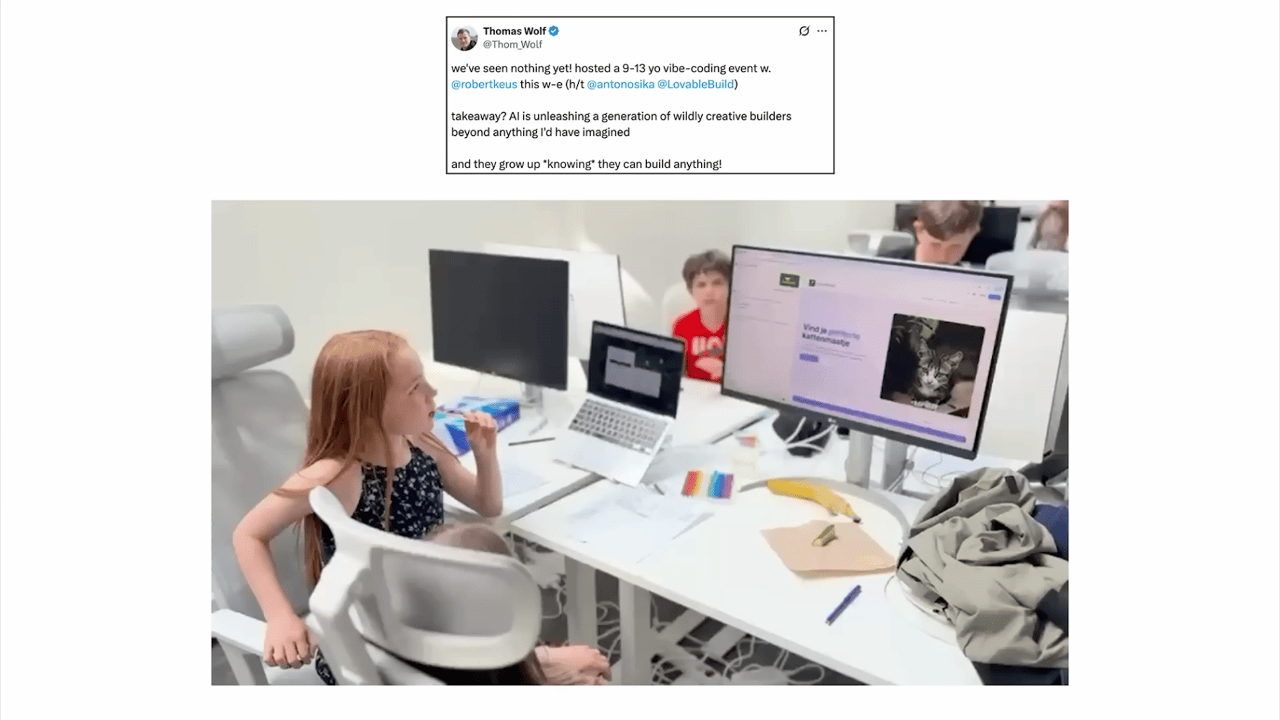 So Tom Wolf from Hugging Face shared this beautiful video that I really love. These are kids vibe coding. And I find that this is such a wholesome video. I love this video. How can you look at this video and feel bad about the future? The future is great. I think this will end up being a gateway drug to software development. I'm not a doomer about the future of the generation, and I think, yeah, I love this video.