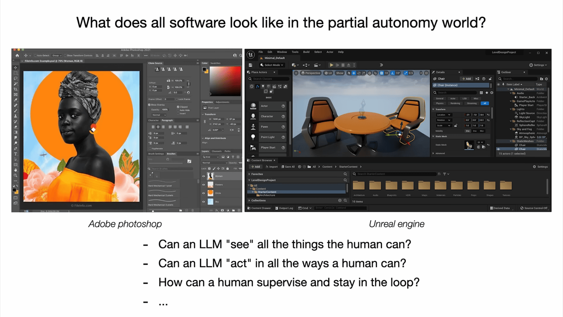 So, I guess my question is: I feel like a lot of software will become partially autonomous. I'm trying to think through what does that look like? And for many of you who maintain products and services, how are you going to make your products and services partially autonomous? Can an LLM see everything that a human can see? Can an LLM act in all the ways that a human could act? And can humans supervise and stay in the loop of this activity?